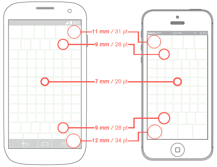 - Users are more accurate at touching the center of the screen and prefer to read content in the center as well. Targets at the edges need to be larger, and further apart.