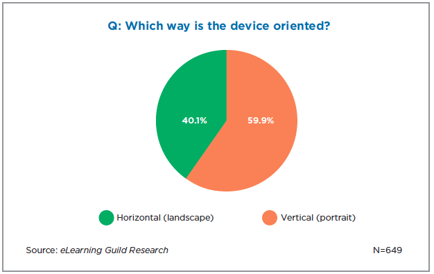 In eLearning, people tend to design for large tablets, especially for the original size of the iPad. We can expect this to change over time as new devices appear in the learning environment. Android tablets outsell iPads, even in North America, and the iPad Mini has become much more popular than the original 9.7-inch iPad. Over time, we can expect better and more capable authoring tools for mobile development of all platforms to emerge to support these needs.